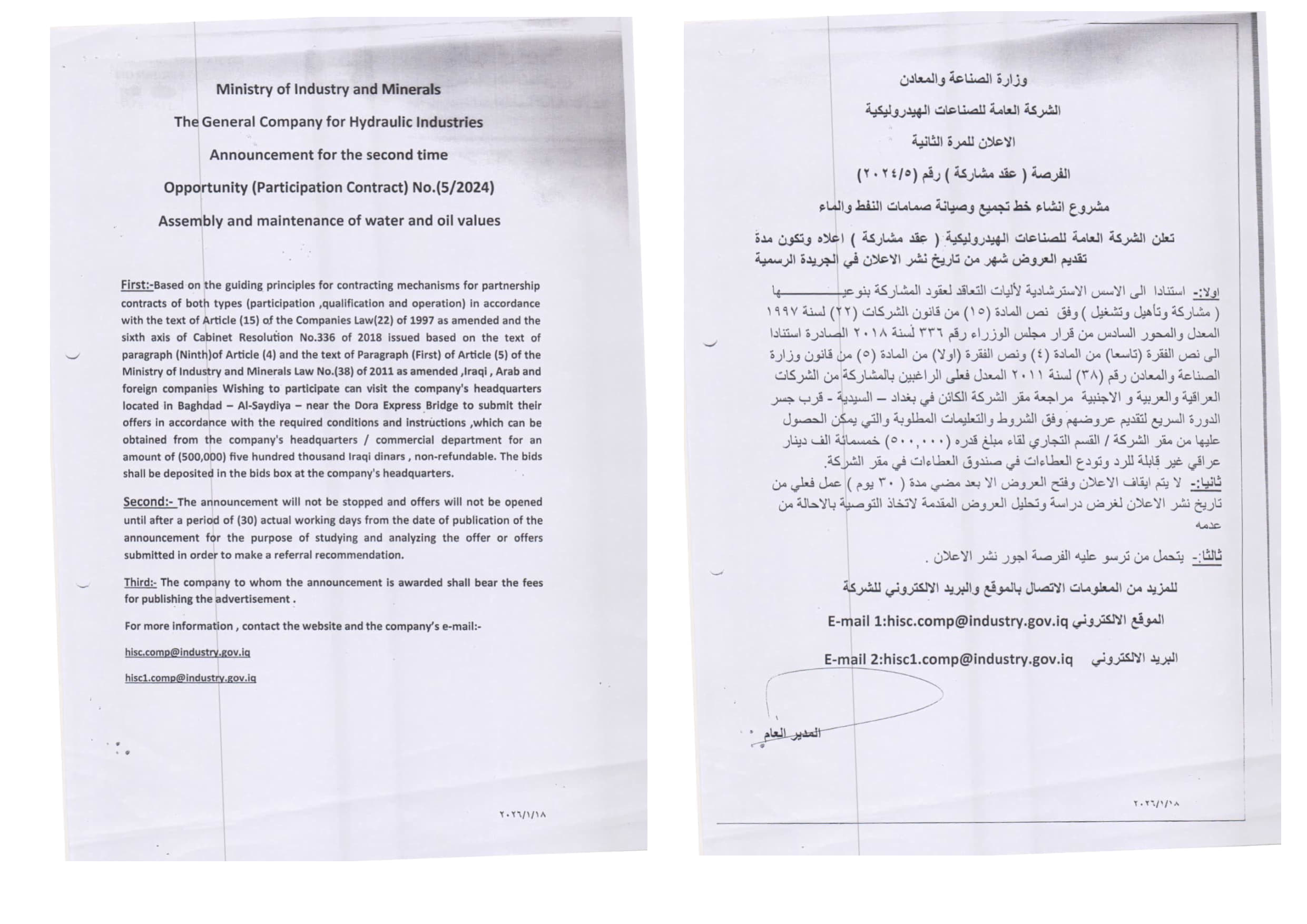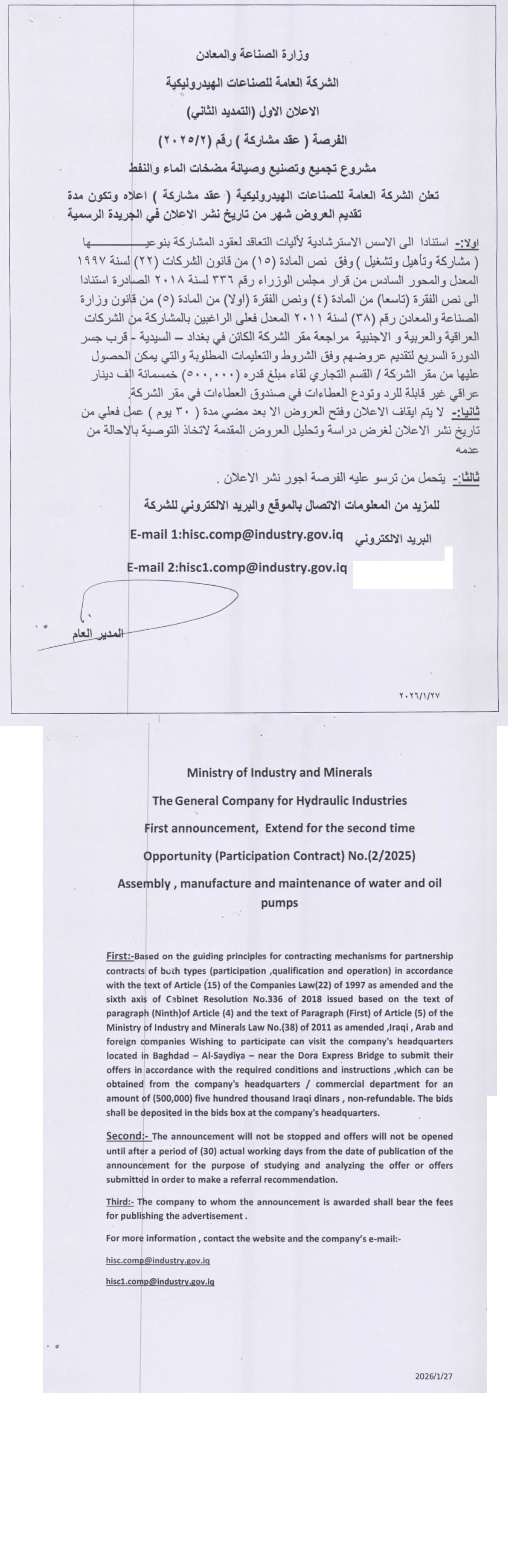 | 2 / 2025 | مشروع تجميع وتصنيع وصيانة مضخات الماء والنفط (عقد مشاركة) | 2026-02-04 | 2026-03-04 | تحميل |